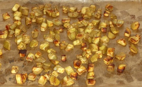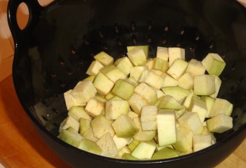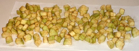 Dry the eggplant cubes with paper towels (it is not necessary to rinse away the salt as long as you haven’t used too much).