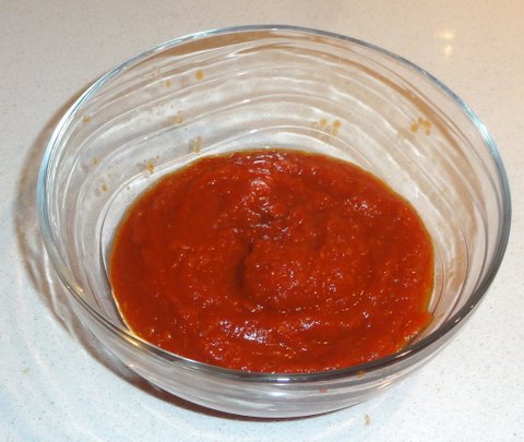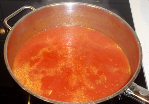 Add tomato pulp and season with salt, freshly ground black pepper and a pinch of sugar. Let the tomato sauce simmer on low heat until it has the consistency of ketchup (i.e. it does not have to be thick, but if you move it around in the pan then you should not see a lot of water seeping out of it). Stir the tomato sauce now and then.
