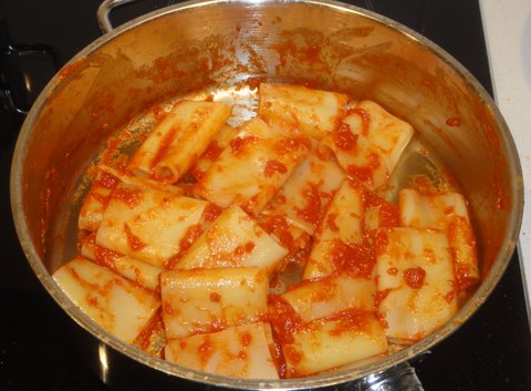 Meanwhile, cook the paccheri or other pasta al dente in salted boiling water (stirring now and then to prevent the pasta from sticking to the bottom of the pan).