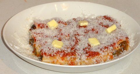 Stuff each of the pasta shapes with the eggplant-mozzarella mixture and arrange them in an oven-proof dish. (I put them directly onto the plates, since I have plates that can be used in the oven.)