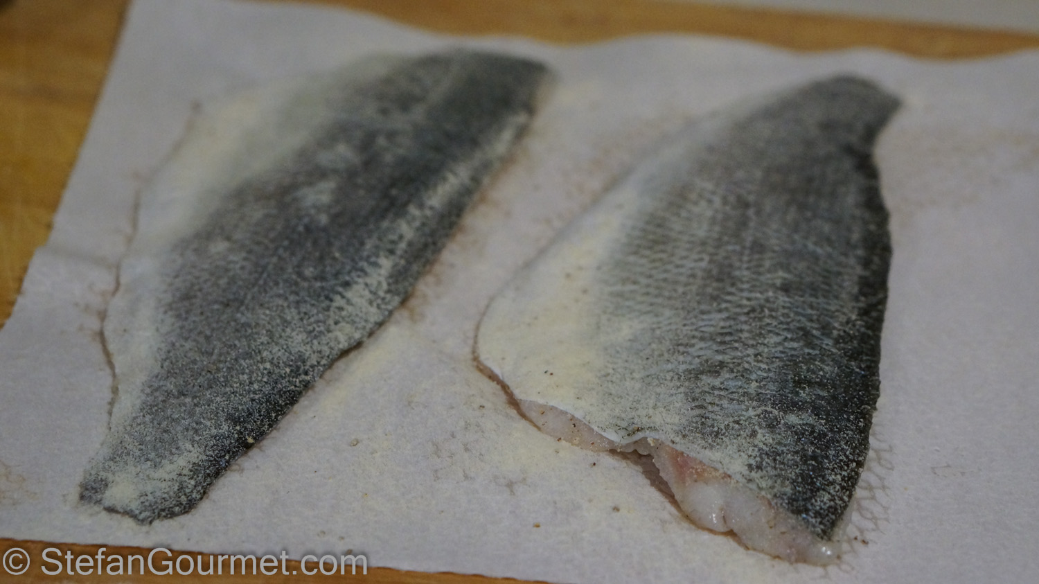 Take the fish out of the bag and pat dry with paper towels. Lightly dust with flour on the skin side only.