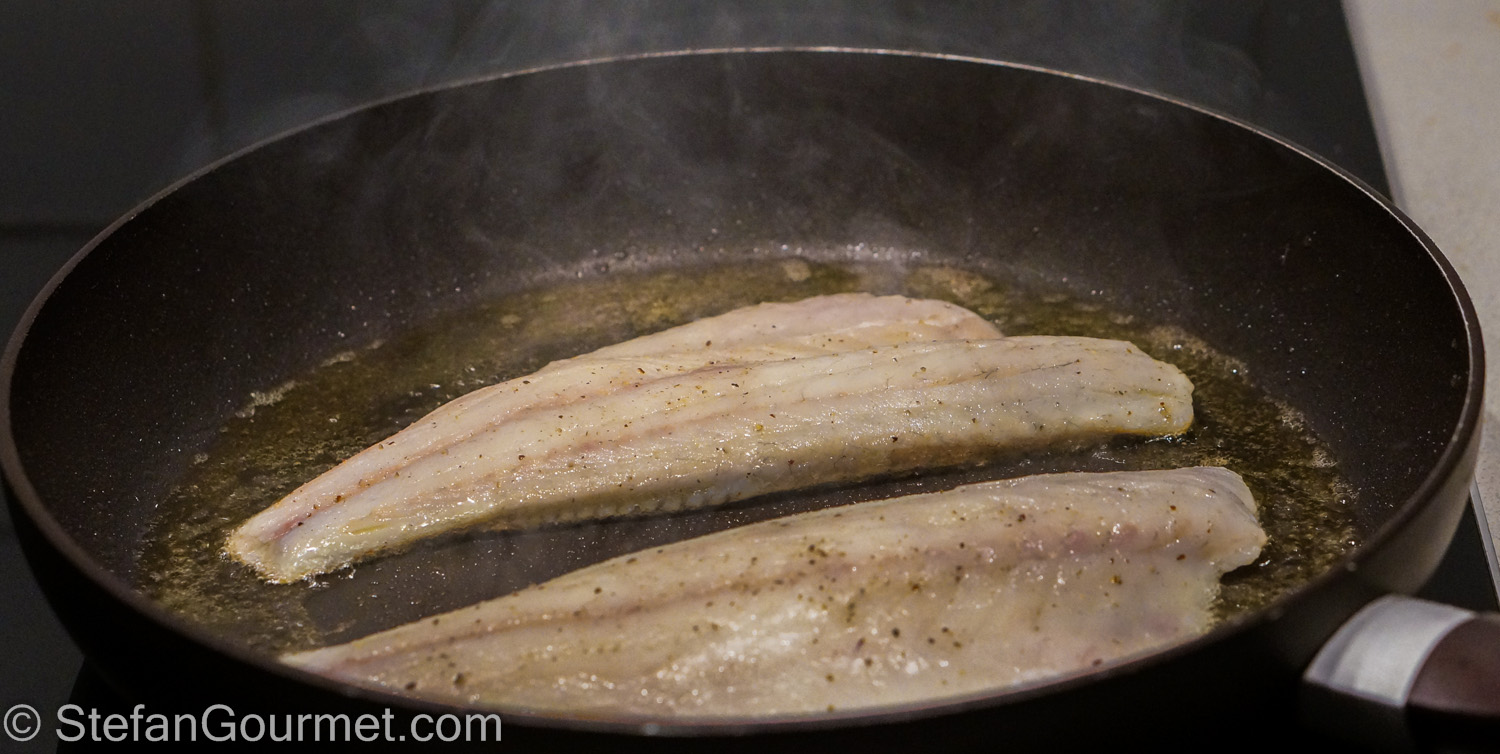 I tried the fish skin side 1 minute in hot oil and clarified butter, but was afraid to overlook the fish. Didn’t work out well…