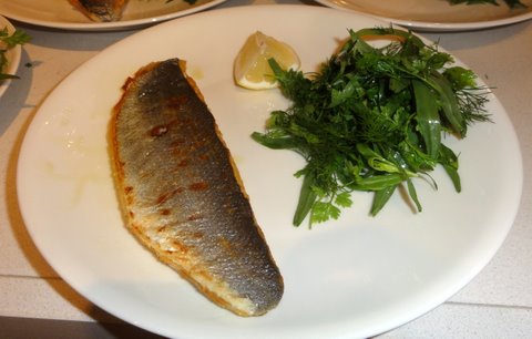 Serve with a lemon wedge. In this picture I added a nice herb salad that tastes great with it: dill, chervil and tarragon, tough stems removed and dressed with some extra virgin olive oil, salt and just a drop of lemon.