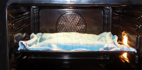 Now cover the dough with a kitchen towel and let it rise for an hour. A good trick to get the right temperature is to put the bread into the oven with only the light switched on (assuming that you do not have LED lighting in your oven, because you need the heat of an old-fashioned bulb).