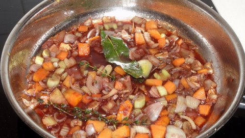Add chopped shallot, minced garlic, chopped onion, chopped carrot, chopped celery, a bay leaf and 2 sprigs of thyme to the frying pan and sautee until golden. Deglaze with a glass of red wine and with a spatula scrape any bits from the bottom of the pan for maximum flavor. Turn off the heat.