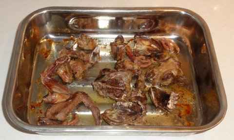 Roughly chop the pigeon carcasses (after removing the innards if your butcher has not already done so) and soak in cold water to remove the blood. Dry the bones with paper towels.