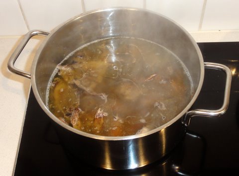 Roast the remainder 2/3 bones pieces in a hot oven (225C/435F) until golden, about half an hour. Deglaze the roasting pan with cold water.