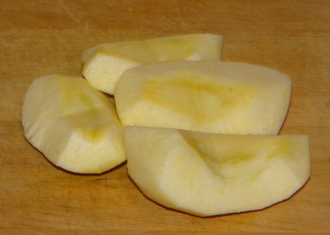 Peel the apples, cut into quarters and remove the core carefully. Cut into smaller pieces and sprinkle with lemon juice to prevent the apples from turning brown. (Use 1-2 tbsp lemon juice altogether.)
