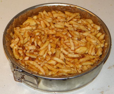 Put the springform on a baking sheet because it will leak a bit and you don’t want the ‘juice’ on the bottom of your oven. Put the baking sheet not in the middle but more towards the bottom of the oven. Bake the apple pie for 70-80 minutes at 175C/350F until nicely browned.