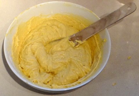 Put the sugar-butter-egg mixture in a bowl. Add the baking powder, sieved flour, pinch of salt and grated lemon zest.