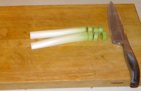 Meanwhile, clean and cut the vegetables. Use only the white and light green part of the leeks. Cut in half lengthwise and then cut in slices as shown.