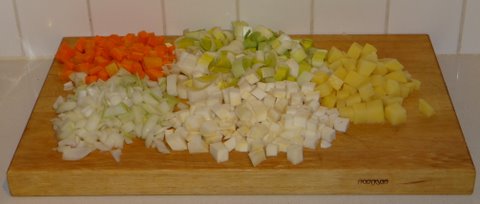 Chop the onion(s). Cut potatoes, carrots and celeriac in cubes (brunoise).