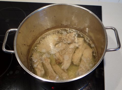 Put the meat in a large pot and add 2 liters of cold water. Bring to a boil and then turn down to heat to simmering (not boiling).