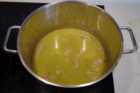 Cook for around 90 minutes until the peas have fallen apart. Stir now and then to prevent the peas from sticking to the bottom of the pot and burning.
