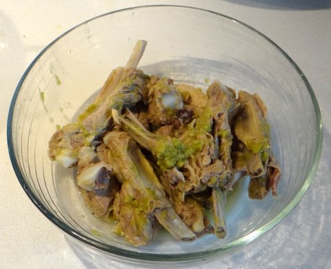 Take the meat out of the pot when the peas are cooked. Put in a bowl to catch any soup that comes along with the meat.