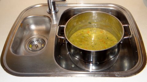 Force-cool the soup by putting the pot into a sink filled with cold water and stirring. Replace the water if it becomes warm. Force-cooling is necessary to prevent the soup from turning sour, which can happen if the cooling process takes too long. Store overnight in the refrigerator (or outside if the weather is like a typical Dutch winter and outside is the same climate as your fridge — just make sure the lid cannot be opened by cats or dogs!).