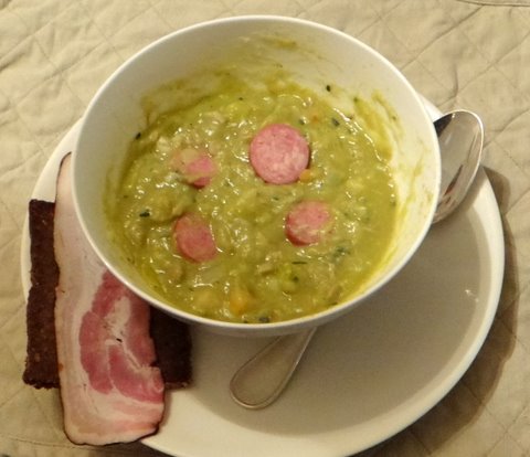 Traditionally, snert is served with dark rye bread and smoked bacon (katenspek) as shown.