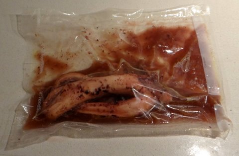 At 65C/149F there was as much liquid in the bag and the octopus was tough. So I’ll stick with higher temperatures from now on.