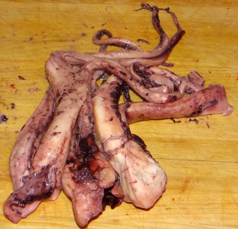 The octopus looked a bit messy, but I knew it would look much better in the salad. I just let it cool to room temperature and sliced it into 1 cm (1/2 inch) slices.