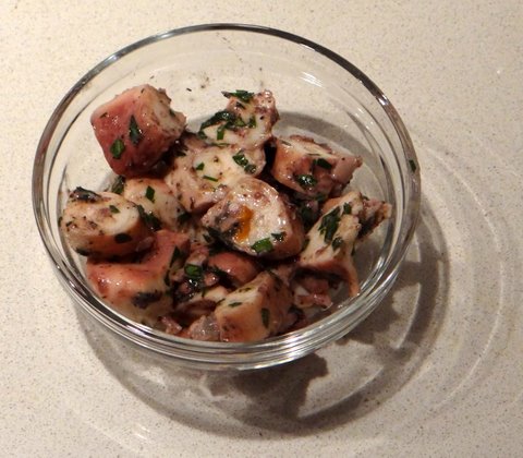 Then I tossed the octopus with chopped flat parsley, good extra virgin olive oil, and lemon juice. I tasted and added more parsley, oil, lemon juice, salt and/or freshly ground black pepper to make it taste just the way I like it.