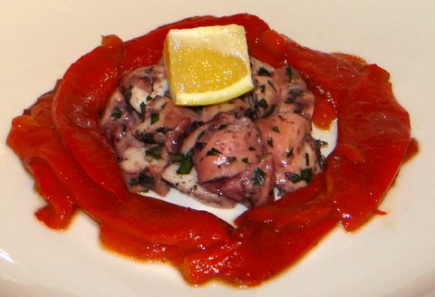 Octopus (as well as squid) combine well with red peppers. I roasted red peppers in a hot (250C/480F) oven for 25 minutes and then let them cool in a closed plastic bag. The steam in the bag ‘cooked’ the skins, which made it easy to remove them. I removed the stem and seeds and sliced the peppers, then I marinated in good extra virgin olive oil with salt, freshly ground black pepper and some good balsamic.