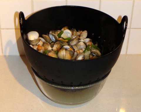Drain the clams and catch the clam ‘juice’.