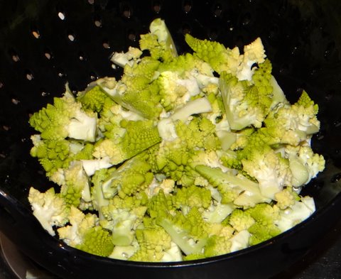 Meanwhile, cut the romanesco into bite-size florets and wash them.