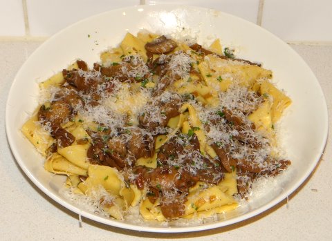 Bring a large pot of water to a boil. Meanwhile, roll out the pasta dough, not too thin, and cut into pappardelle of about 2-2,5 cm (1 inch) wide and 30-35 cm (12-14 inches) long. Sprinkle the pappardelle with semolina flour to prevent them from sticking together. (Don’t forget to keep stirring the mushrooms now and then. Don’t cook the mushrooms too long because there should be enough liquid left to coat the pasta.)