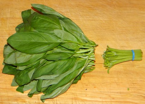 Cut the biggest stems off the basil. It is a lot of work to take off all the leaves individually, and you won’t taste the difference anyway. Wash the basil if needed and spin dry.