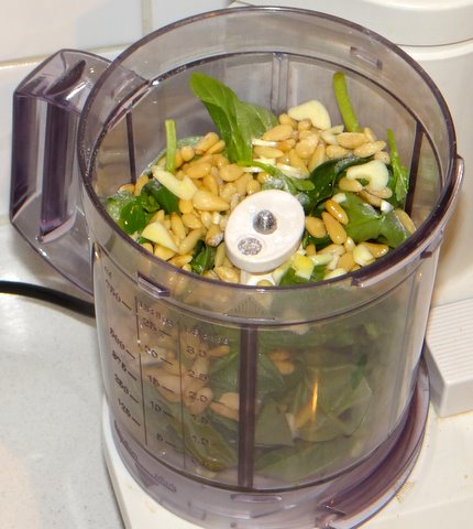 Put the basil, pine nuts, chopped garlic and extra virgin olive oil in the blender.