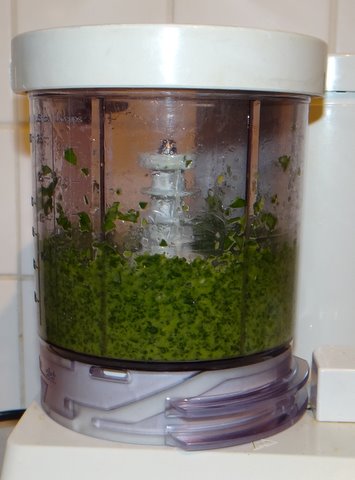 A problem in the Netherlands with making your own pesto is that in most Dutch supermarkets basil is sold in small bags at a ridiculous price of EUR 1.00 to EUR 1.40 for 15 grams, meaning that you’d spend 4-6 euros for the basil alone. That takes away the fun! Basil plants in a pot are slightly cheaper, but especially in winter that basil doesn’t have much taste. Luckily at Marqt (expensive for most stuff) they sell 80 grams of basil for 1.80 euros.