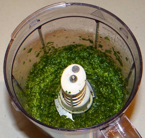 Blend on a low speed to obtain pesto that tastes of basil and is somewhat coarse. If you like it more smooth, blend on high speed.