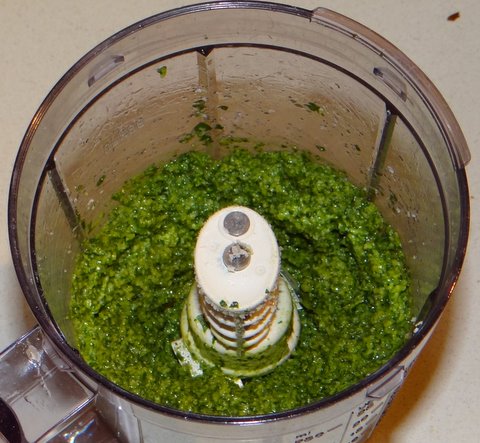 Pesto will taste best if you make it the day before, to allow the flavors to blend. That will especially take the ‘edge’ off the garlic flavor. I usually make pesto without exactly weighing the ingredients. For this occasion I have kept track of what I was doing for giving more exact proportions in this post, but there is no strict rule for making pesto. Just do what you like best!
