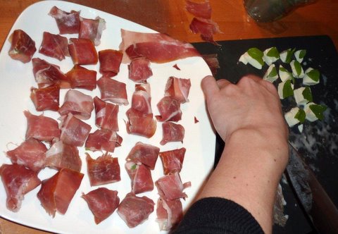 • Wrap each cube of mozzarella together with half a sage leave in thinly sliced prosciutto di parma (in total you will need around 200 grams or 7 oz)