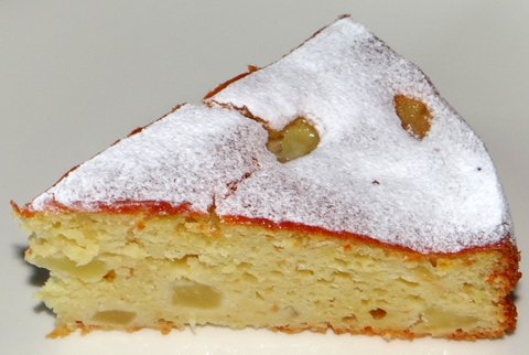 I tried this new idea for a cake on Sunday for a dinner party with my parents, and it was a big success! I had seen a recipe for a pear cake using ricotta instead of butter on GialloZafferano.it, and since pears and almonds are a good combination I thought I’d enrich it with almonds. It came out great: not too sweet, fresh and fruity, relatively light but not dry. And very easy to make if you don’t mind peeling some pears.