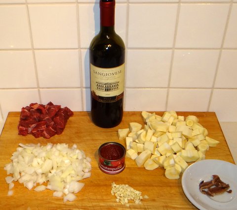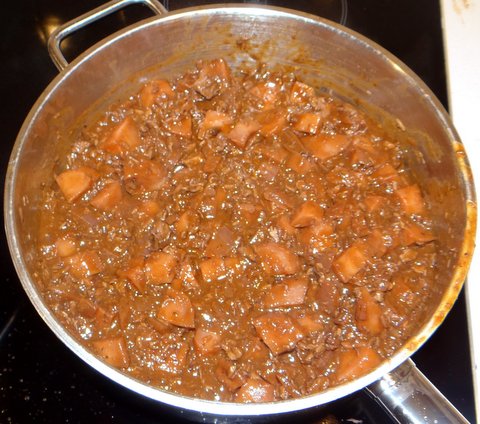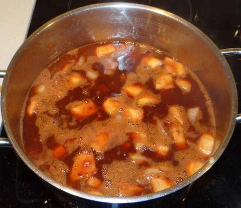 Add the beef and mix. Add just enough red wine to cover everything. Bring to a boil and then turn off the heat immediately. Cover the pan and put in the oven at 160C/325F for 90 minutes until the beef is tender.