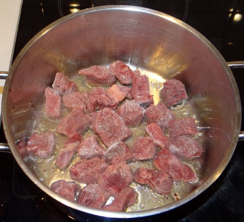 Season the beef cubes with salt and pepper and sprinkle with flour. My beef came with a nice layer of fat that I trimmed and rendered to use the rendered beef fat for browning the beef for additional flavor. You could also just use some olive oil. Heat the oil or beef fat in a casserole (35aweek’s recipe uses a Dutch oven, but although I am Dutch I have no clue what this — go figure!). Brown the beef cubes on all sides and take out of the pan. Preheat the oven to 160C/325F.