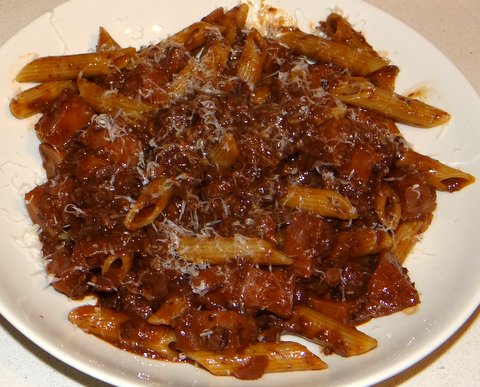 I saw the recipe for Wine-braised beef & parsnip ragù on 35aweek‘s blog and thought it could be good, even though I had never tasted or heard of this combination. So I decided to give it a try, sticking mostly to her recipe. Cooking beef and vegetables in the same stew is always a challenge since the temperature needed to cook the vegetables is too high to cook meat without drying it out, but this recipe works around that by shredding the beef. The good thing about drying out the beef is that the flavor doesn’t just disappear but ends up in the sauce, making it very tasty. I was very happy with the result, adding a whole new flavor to my repertoire of pasta sauces. It took some getting used to, but after a few bites I really started to like it. I’ll definitely make it again, but next time I’ll cut the parsnip a bit smaller.
