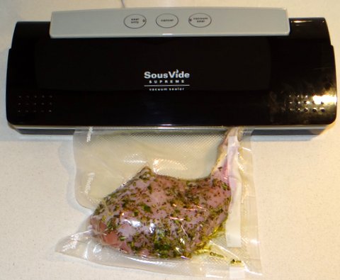The preparation is extremely simple. Season each rabbit leg with salt and freshly ground black pepper and insert it into a pouch. Rub with about half a tablespoon of chopped fresh rosemary on all sides while it is in the pouch (this is easier than to try to get the rabbit with the rosemary on it into the pouch). Seal and cook for 2 hours at 60C/140F.