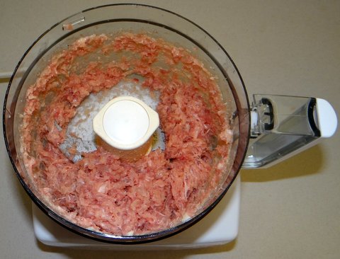 Meanwhile, if using chicken thigh meat, cut the meat into pieces and put into the food processor.