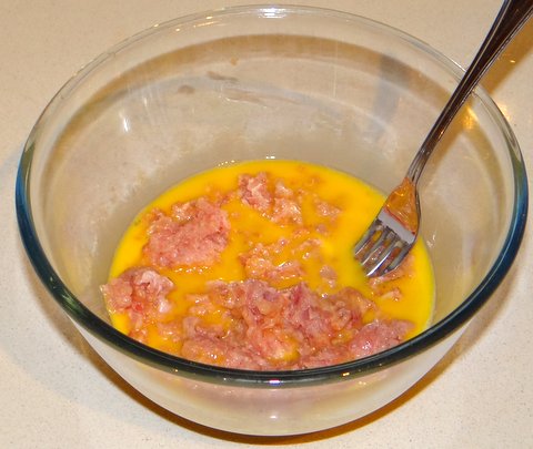 In a bowl, beat the egg with 2 egg yolks. Add the other half of the ground chicken and mix with a fork.