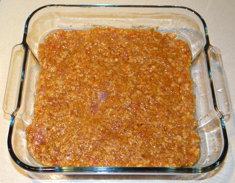Brush a baking dish (approximately 20 x 20 cm or 8″ by 8″) with sesame oil. Spread the meat mixture into the baking dish. Preheat the oven to 225C/440F.
