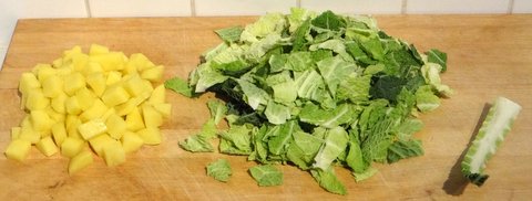 Peel the potatoes and cut into cubes (about 1 cm or 1/3 inch). Remove the large veins from the cabbage (you should have about 125 grams or 0.28 lbs left) and cut the leaves into pieces (about 2 cm or 1 inch).