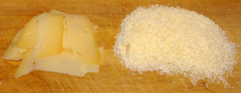 Meanwhile, cut the Valtinella Casera into thin slices and grate the parmigiano or grana.