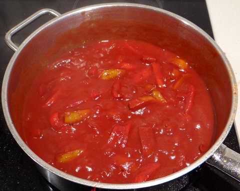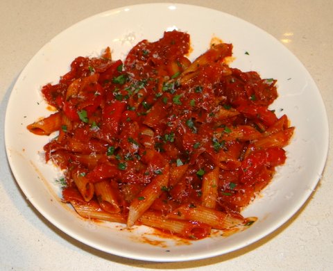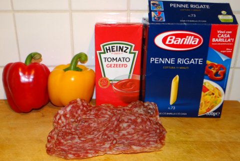 This pasta dish was inspired by a dish on the menu of my favorite trattoria in Amsterdam: Lo Stivale d’Oro. They have “tagliatelle alla pugliese” on the menu, which is tagliatelle with peppers, salami and tomato sauce. (I have never seen this dish in Puglia, so my guess is that it is called pugliese because they use hot salami from Puglia.) I like it better with penne and prefer to use a type of salami that is not as hot. The taste of the dish is determined to a great extent by the salami used. I prefer to use a good quality Italian salami like sopressa or finocchiona (with fennel seeds).