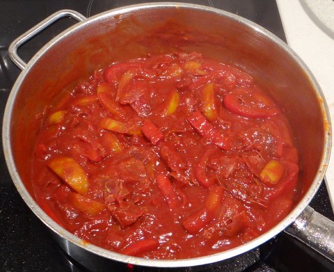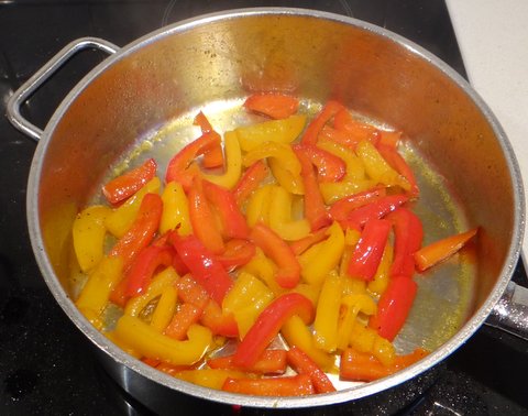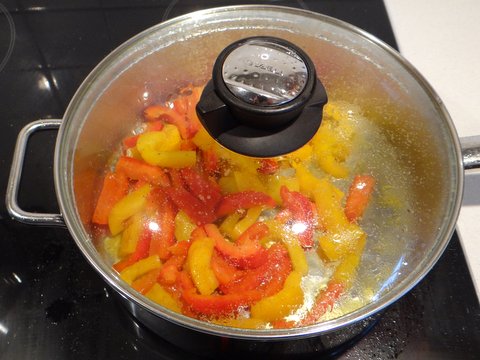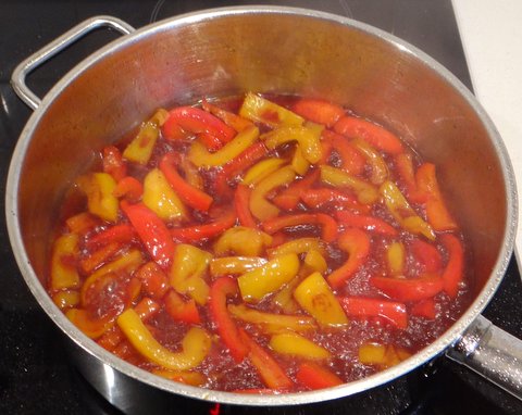 Cover the pan and lower the heat. Let braise for 10 minutes or so until the peppers are tender but still firm to the bite, stirring now and then.