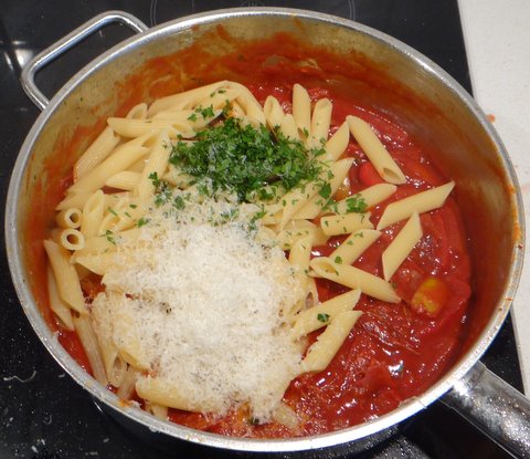 Drain the pasta and add it to the sauce, together with freshly grated parmigiano reggiano and most of the chopped parsley. Toss to mix.