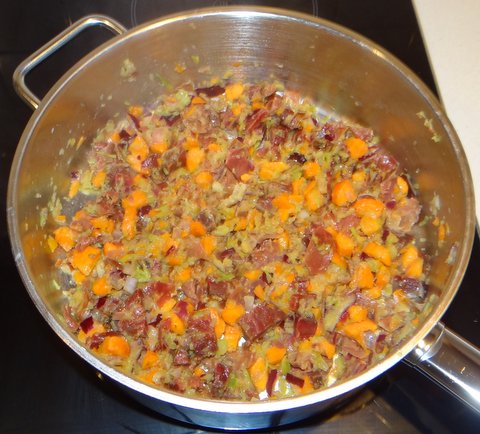 Sauté the prosciutto, carrot, onion and celery in the olive oil over medium heat until the onions are soft and fragrant, about 5 minutes.