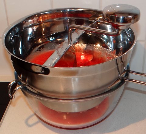 Meanwhile, puree the tomatoes in your food processor and pass them through a food mill to remove the skin and seeds. (There is no need to remove the skin and seeds first, this is much easier and the tart juice that surrounds the seeds ends up in the sauce this way.)