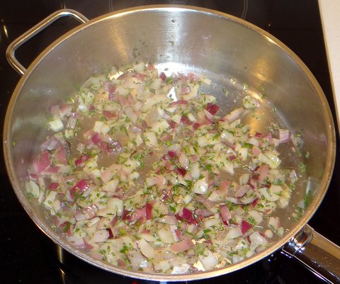 Heat 2 Tbsp olive oil in a frying pan. Add the onion and rosemary and sauté over medium heat until the onion is translucent.